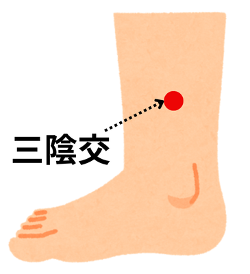 手と足を温め、体と心の力が抜けると安らかになり眠気がさします。 - 三陰交(さんいんこう): 足の内側のくるぶしから指4本分上。