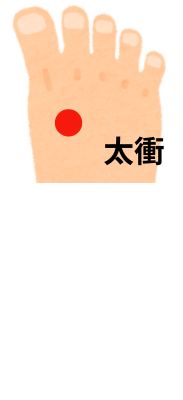 - 太衝(たいしょう): 足の甲の親指と人差指の骨が交わるところから、やや指先よりのへこみ部分。