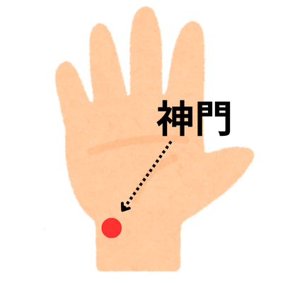 頭部の血行を整えて痛みを緩和します。 - 神門(しんもん): 手首の曲がりジワを小指側へなでてゆき、骨の出っ張りの手前で指が止まる部分。